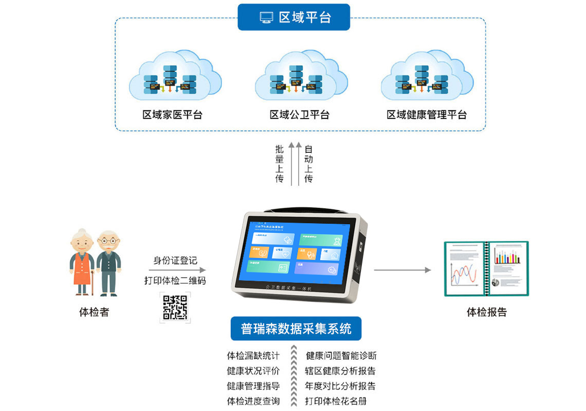 該系統按照縣、鄉、村三級應用設計,以便捷式應用、智能化應用、多場景應用為導向,按照滿足院內專業體檢、下鄉便攜式體檢、移動體檢車體檢及區域化融合體檢等多種模式搭建,為基層醫療機構公共衛生信息化最后一公里提供一站式解決方案,實現國家“讓數據多跑路,百姓少跑腿”的相關要求。