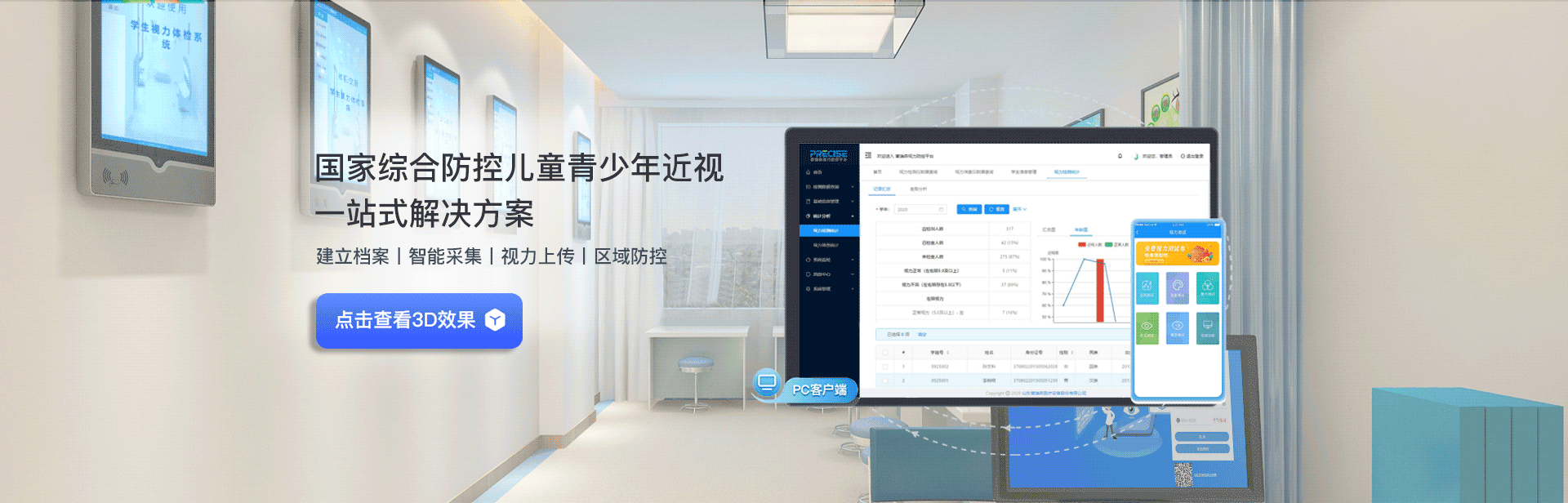 該系統(tǒng)檢測項(xiàng)目齊全,功能操作流暢并伴有溫馨的語音提示,操作簡便易上手。可多維度展示青少年視力發(fā)展趨勢并及時(shí)預(yù)警,為教育和醫(yī)療機(jī)構(gòu)及家長提供視力健康預(yù)防和干預(yù)治療的參考方案,共同呵護(hù)孩子的眼睛健康,讓他們擁有一個(gè)光明的未來。